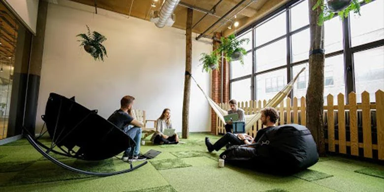 Les bureaux de l'entreprise GSoft avec une zone de poufs et hamacs