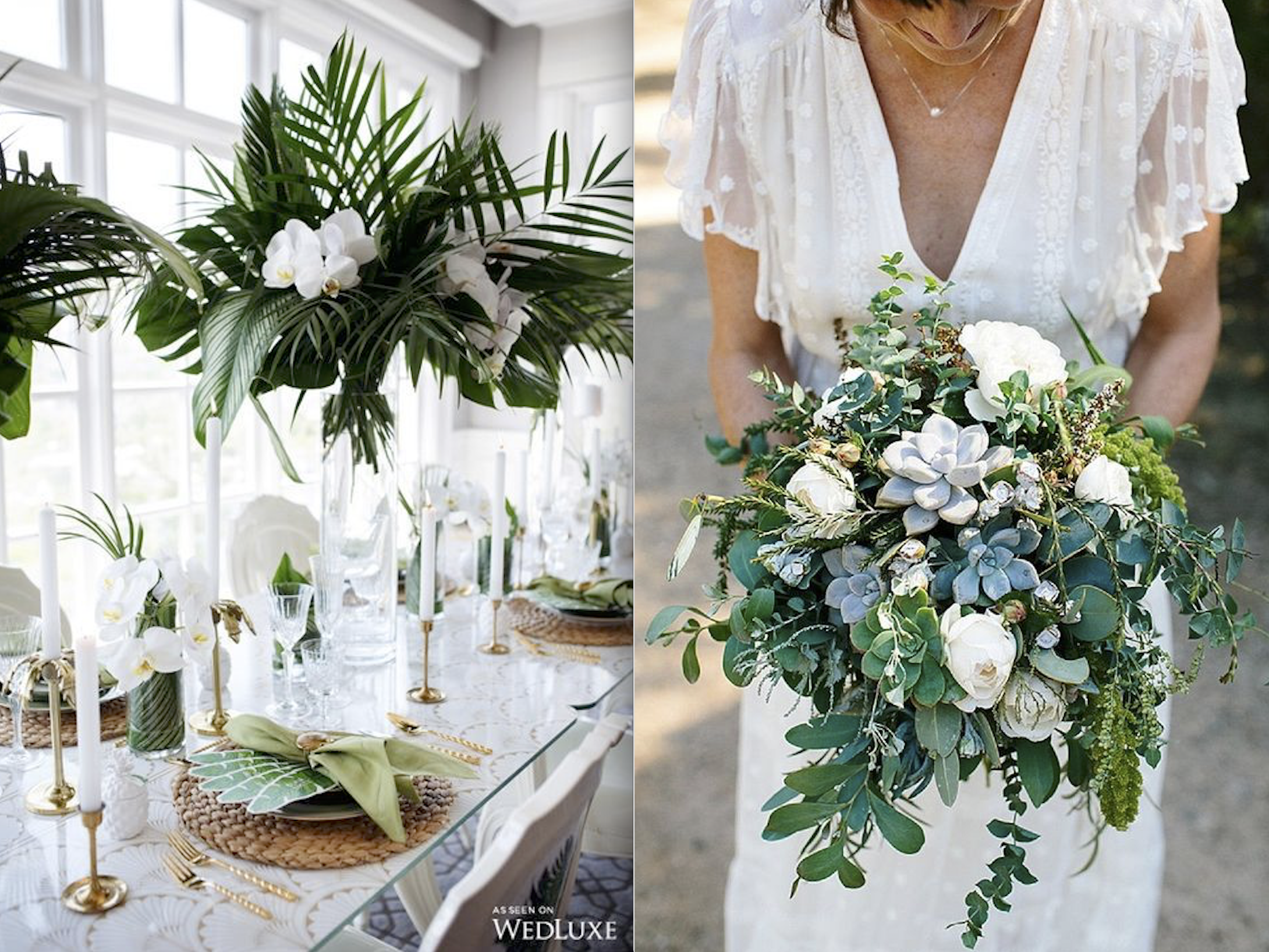Vous n’aimez pas nécessairement une couleur en particulier ou encore aucune fleur précise? Pourquoi ne pas oser marier le blanc et différents types de verdures? Les plantes grasses, l’eucalyptus, les feuilles exotiques mixés avec les pivoines, les orchidées ou les roses blanches offrent exotisme et classe à votre réception. Le tout se veut autant bohème qu’élégant! Petit plus : ajoutez des éléments de couleurs neutres et naturels. Ils renforciront le thème et feront ressortir le vert et le blanc utilisés.