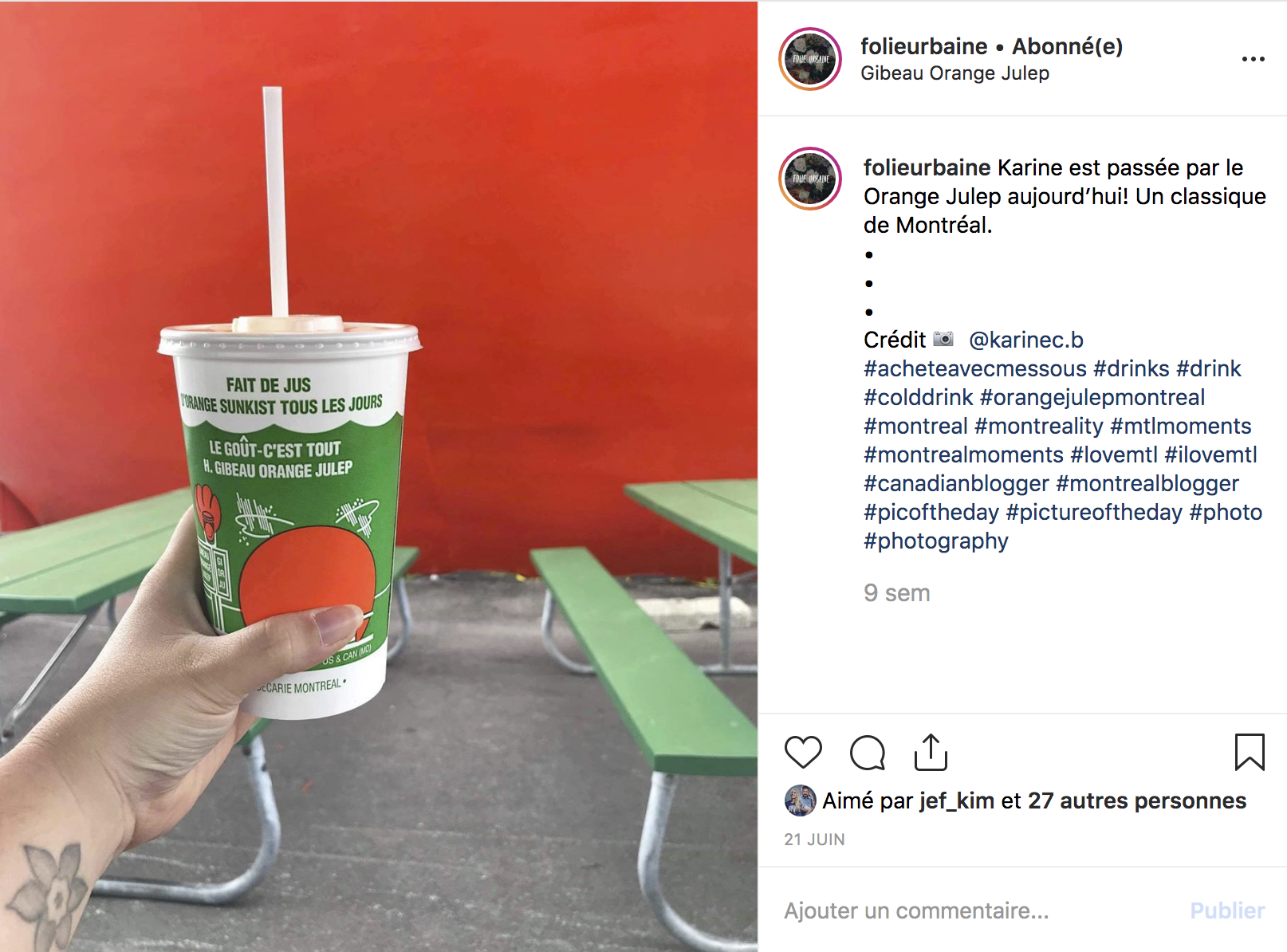 J’ai grandi à Montréal, mais je n’ai aucun souvenir d’être déjà allée goûter le traditionnel jus Orange Julep. L’autre jour, je suis allée récupérer du matériel avec un collègue de travail et sur la route du retour, on s’est arrêtés pour dîner. Je me suis pris un jus et malgré les commentaires que j’avais entendus, j’ai tellement aimé ça. Juste d’en parler, j’ai envie de faire un détour pour aller m’en chercher!