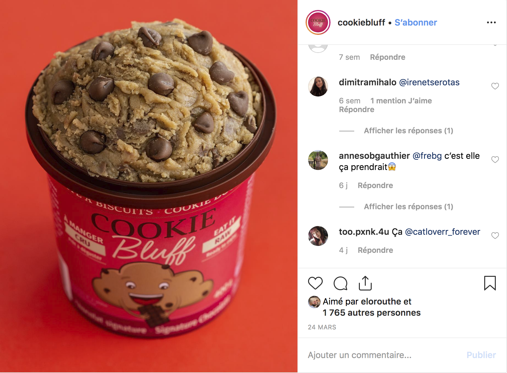 Je suis COMPLÈTEMENT accro à la pâte à biscuits! Et je plaide coupable ; il m’arrive d’en faire et d’en manger même si ce n’est pas conseillé de la manger crue. C’est pourquoi j’ai été un peu euphorique quand j’ai vu qu’on pouvait en manger sans risque en se procurant celle offerte par la compagnie Cookie Bluff. Cette entreprise québécoise a vraiment le vent dans les voiles et jouit d’une belle popularité sur les réseaux sociaux. Leurs publications me donnent l’eau à la bouche chaque fois et jusqu’ici, j’ai craqué pour les saveurs de gâteau de fête et biscuits aux pépites de chocolat.